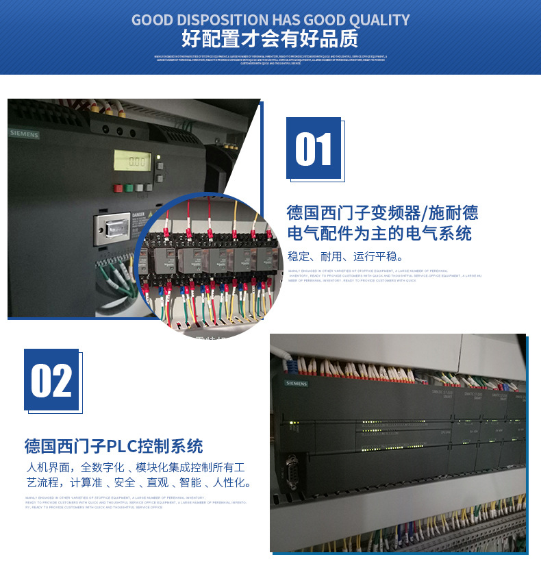 電氣控制:采用質量可靠的配置,以西門子PLC、施耐德配件為主要基礎。