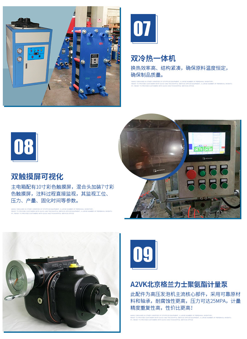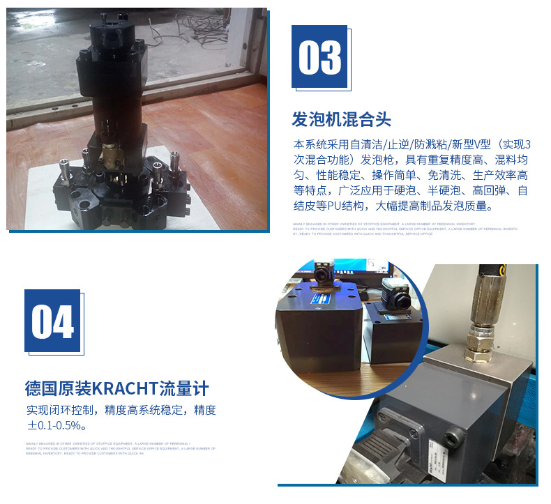 混合裝置:本系統采用自清潔/止逆/防濺粘/新型V型(實現3次混合功能)發泡槍,結構美觀、操作方便。配合西門子聚氨酯專用泵,注射準,混合效果很好。